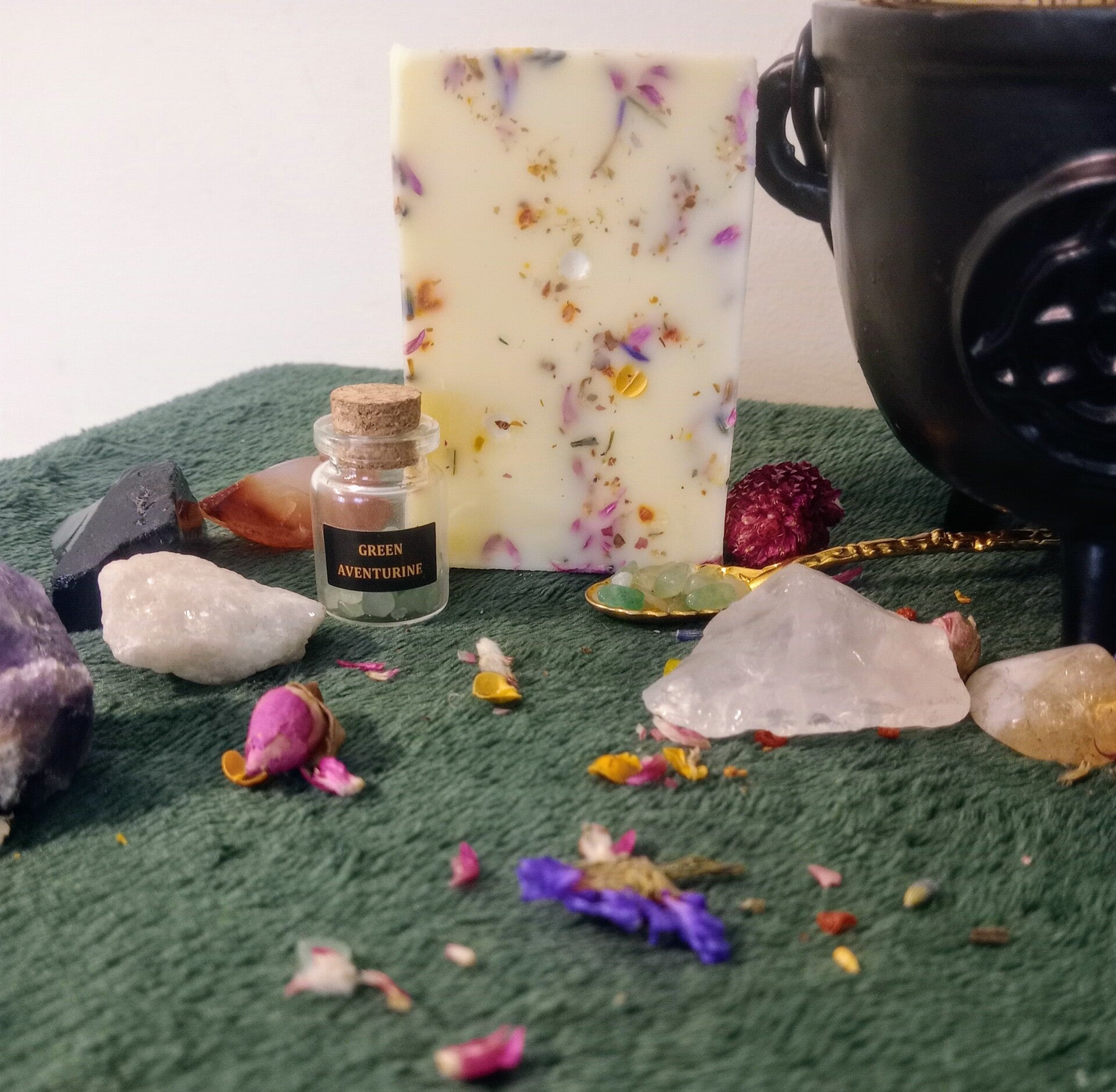 Shea butter soap infused with real flower petals and Green Aventurine crystals The stone of opportunity and luck